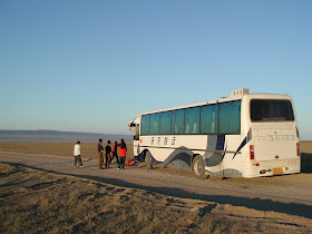 When you travel in a desert, don't expect there is a toilet in the middle of no where. Thus, when the bus driver feels like going, he will stop the bus, turn to the back and say - under the sky, if you want to go singing, boys to the left, gals to the right, bring your umbrella if you have one! :-)